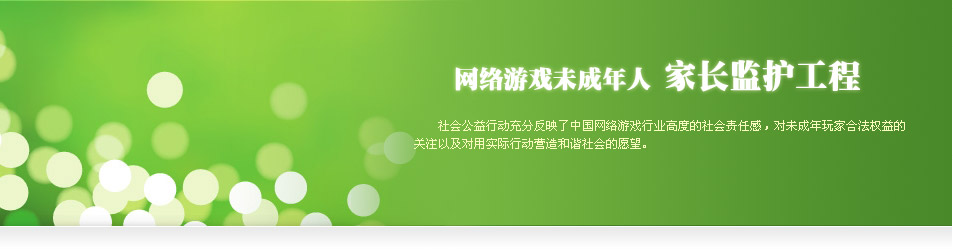 “网络游戏未成年人家长监护工程”是一项由完美时空、腾讯、盛大游戏、网易、搜狐畅游、巨人网络六家网络游戏企业共同发起并参与实施,由中华人民共和国文化部指导,旨在加强家长对未成年人参与网络游戏的监护,引导未成年人健康、绿色参与网络游戏,和谐家庭关系的社会性公益行动。它提供了一种切实可行的方法,一种家长实施监控的管道,使家长纠正部分未成年子女沉迷游戏的行为成为可能。
